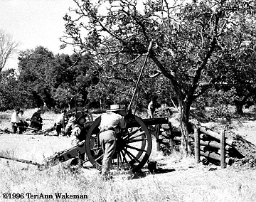 Two of a battery of six cannon loaded with the crews at ready waiting for the order to fire.