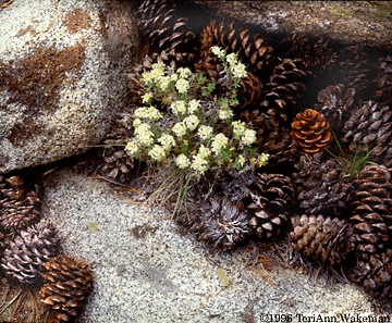 Spring wild flowers among the pine cones in the White mountains of California